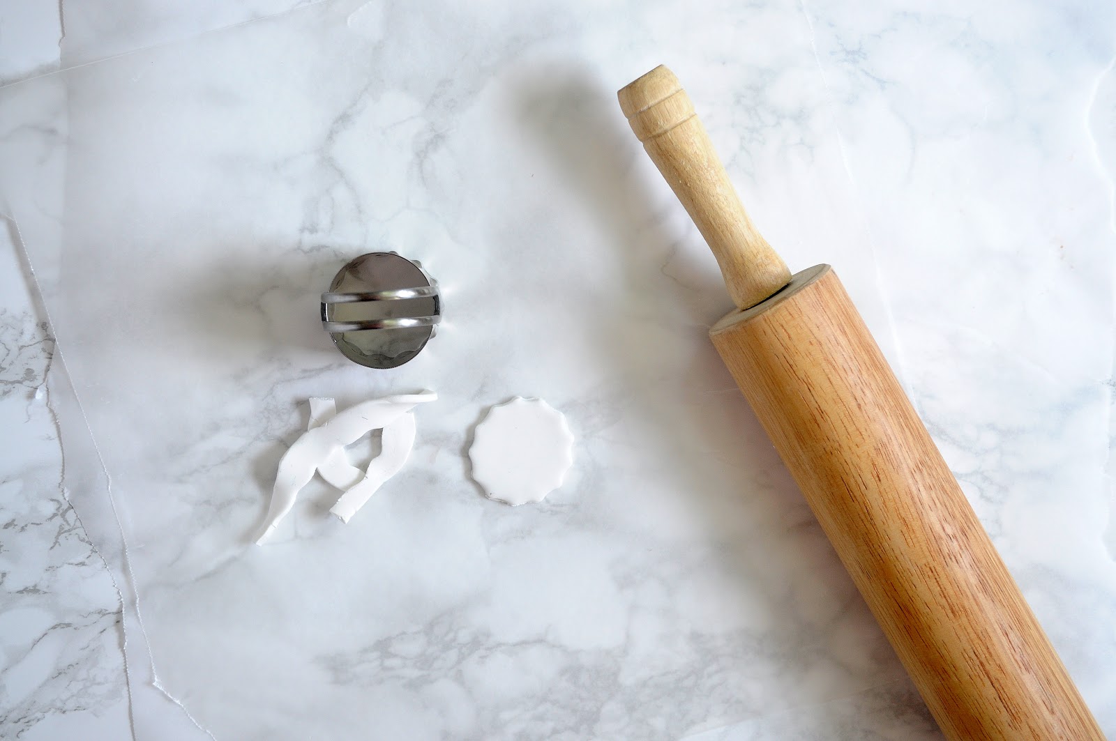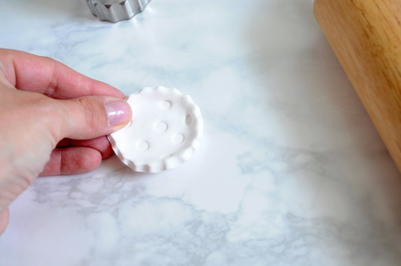 Start by rolling out your clay, keeping it uniform thickness of about 1/2 an inch. Use the biscuit cutter to carefully cut shapes. {If any edges are jagged, gently smooth them with your finger, or just re-roll the clay and try again!}