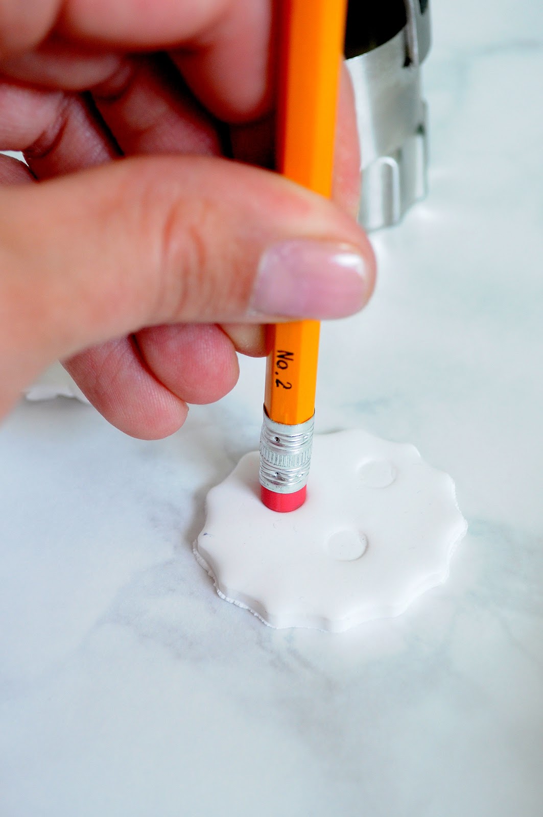 Using the pencil eraser, gently press dots into the clay.