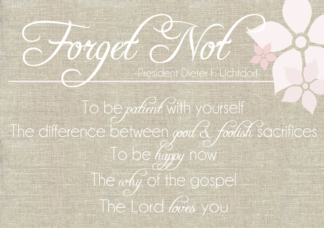 We specifically enjoyed watching listening to President Uchtdorf. {C’mon ladies, isn’t he good lookin? I have heard him called the Silver Fox a time or two! lol} Anyway his message really hit home for me as I am easily distracted and love how he worded his message… “Dedicating some of our time to studying the scriptures or preparing to teach a lesson is a good sacrifice. Spending many hours stitching the title of the lesson into homemade potholders for each member of your class may not be.” I know you laughed out loud with me at that one 🙂
