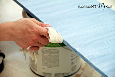 First I painted both sides of my wood pieces white as the base color. Then I mixed up a little blue paint and glaze and starting wiping it on the wood in a horizontal direction.