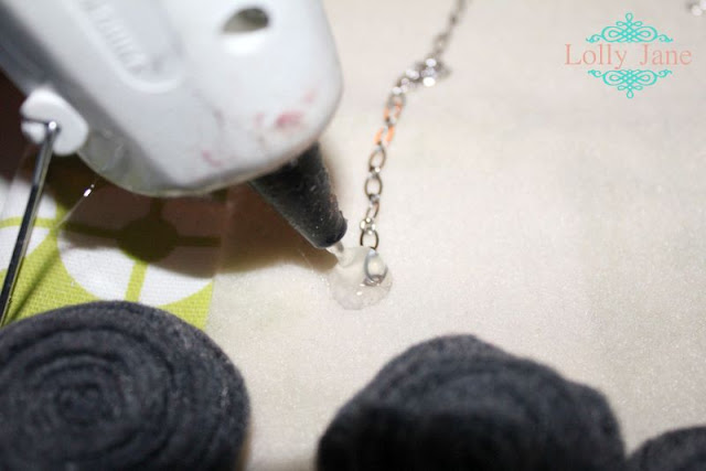 Slide your necklace chain in between the top rosettes and the scrap fabric before and THEN glue, like so:
