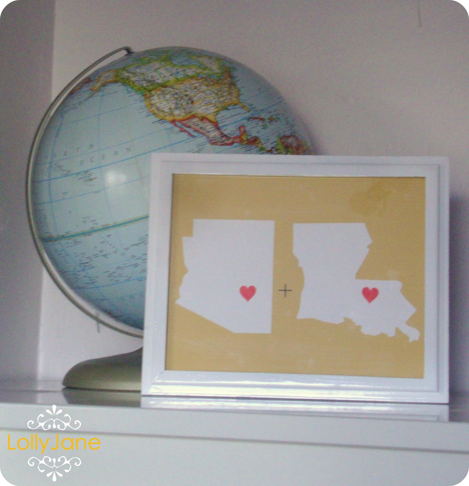 Love love love this! I made my own version of this for my friends engagement present, except I put in a sticker of 2 love birds with a heart above them that looked identical to the hearts in the respective states – it looked as though the birds had flown to find one another! Adorable!!! Thanks so much 😉