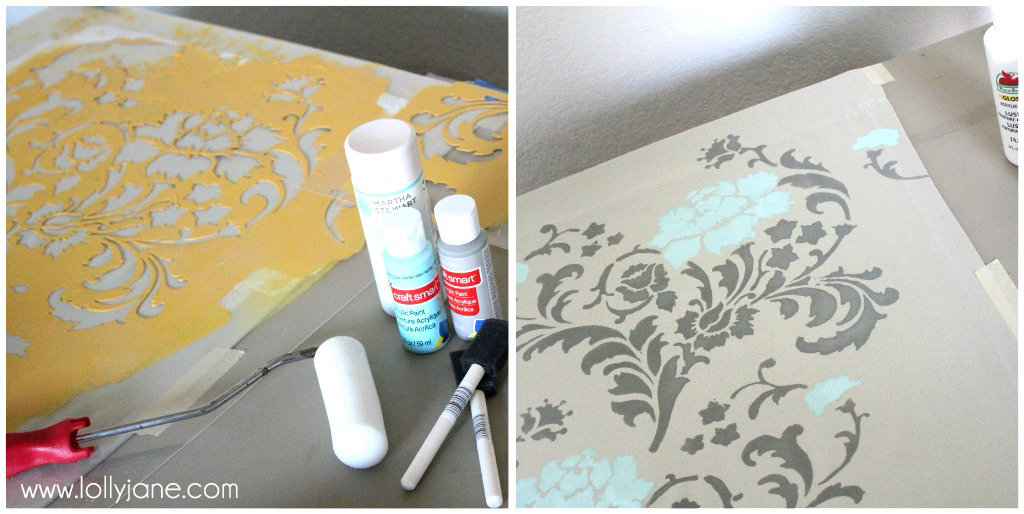 We rolled everything gray first, leaving the turquoise flowers alone then went back and dabbed them while the stencil was still on top of it. Make sense? We didn’t take the stencil off until we knew we were completely done with that section, going back over it would be too crazy!